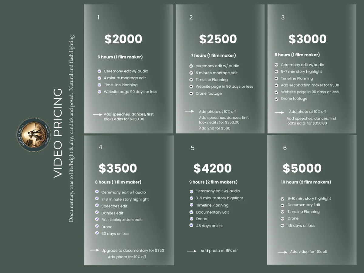 We can do this. We have recently created a step by step builder that allows you to create a package that meets your need, wants, and budget. While choosing our standard wedding video packages saves you hundreds over the equivalent a la cart pricing, you may only want certain things. When you fill out an inquiry and vocalize your interest in custom packages, I will walk you through the builder and send a proposal for only the things you want to invest in. Ask us about the builder today.